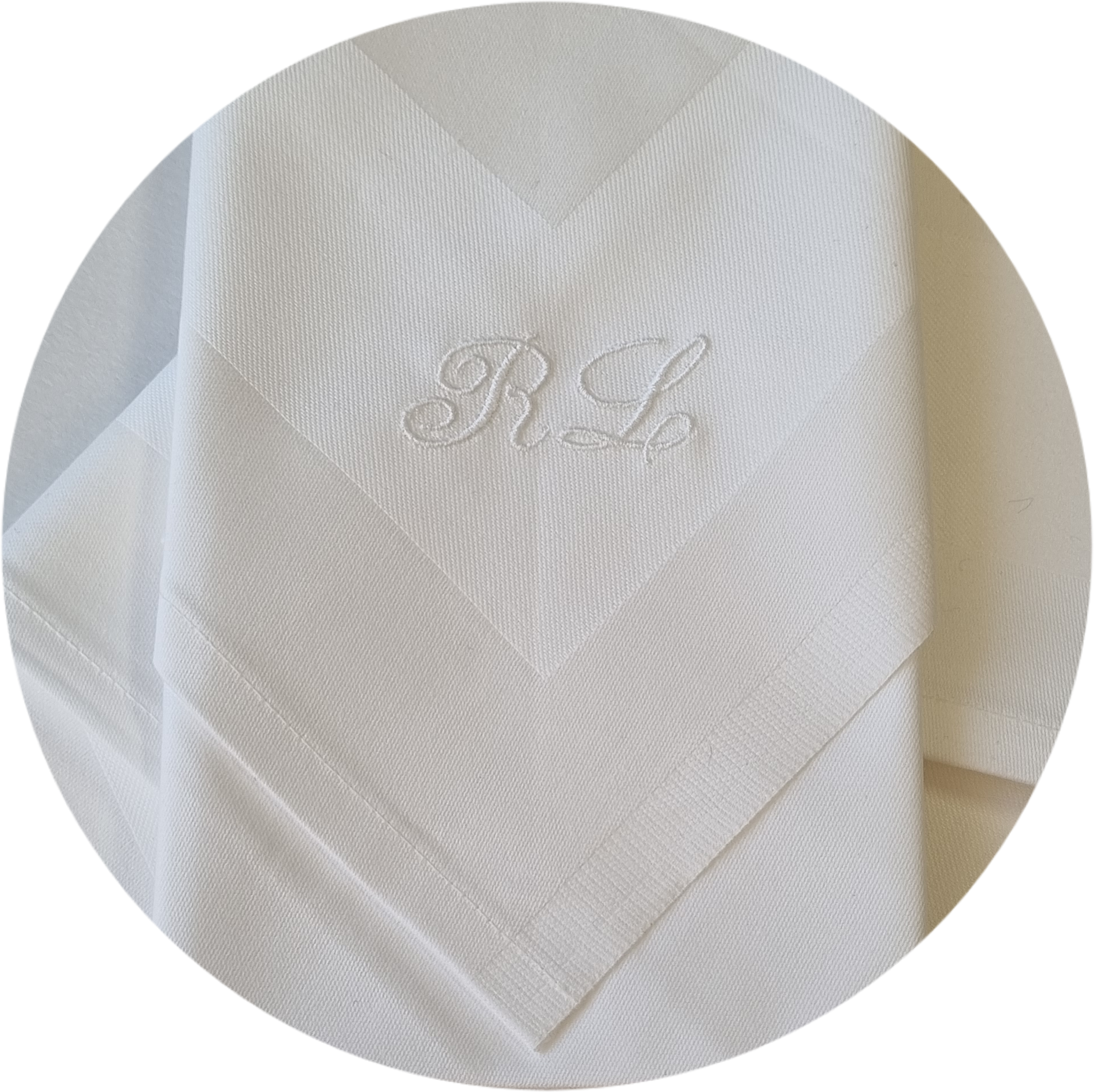 Diese 50x50 cm großen Servietten aus hochwertiger Baumwolle bestechen durch ihre feine gewebte Atlaskante und sind in verschiedenen, eleganten Farbvarianten erhältlich. Die exklusive Monogramm-Stickerei, gefertigt mit erstklassigem Stickgarn, verleiht jeder Serviette eine persönliche und luxuriöse Note – perfekt für anspruchsvolle Tischdekorationen mit Stil und Raffinesse.